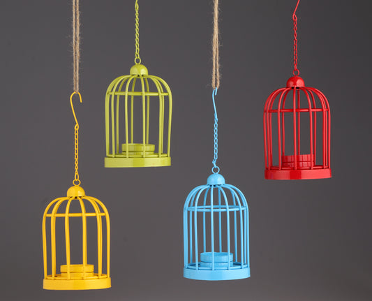 Metal Bird Cage Candle Holder | Multi-colored Hanging Bird Cage - Blue, Green, Red, Yellow | Home Decor | Set of 4