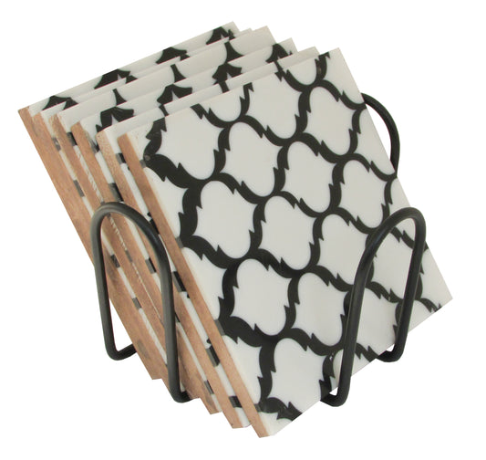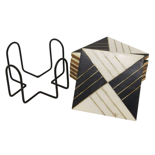 Handmade Designer Rectangle Wooden Coasters | Black and White Geometric Pattern Wooden Drink Coasters - Set of 6 | Gift for housewarming | Stand included