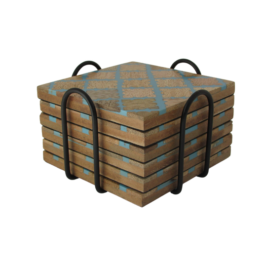 Handmade Designer Square Wooden Coasters | Brass Inlay Drink Coasters - Set of 6 | Gift for housewarming | Stand included